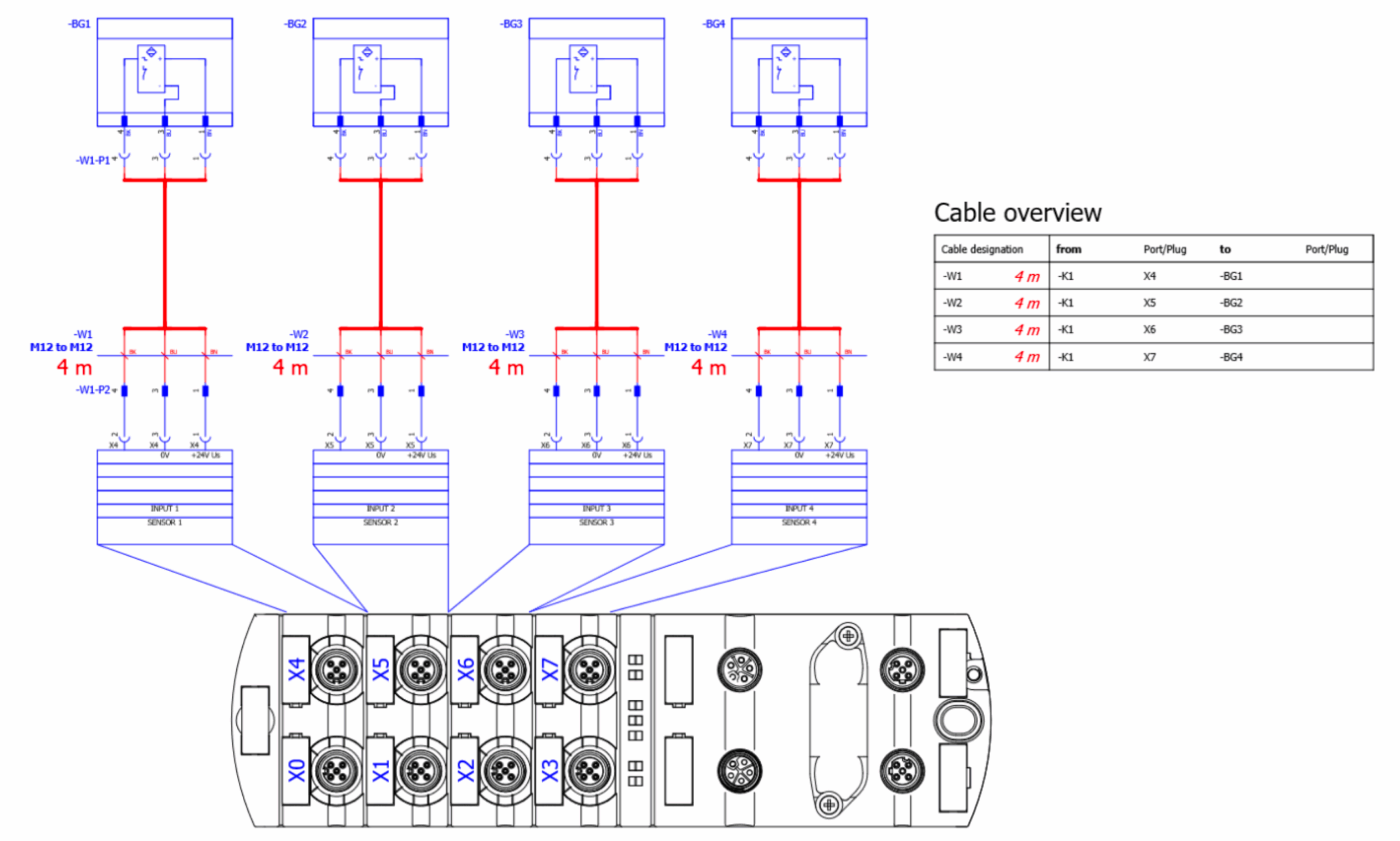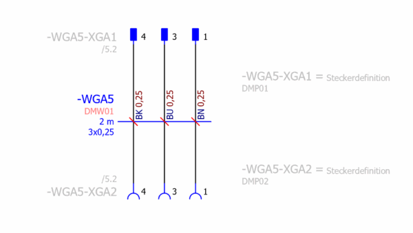 Bei dem neuen Aufbau nach Eplan-Dokumentation werden Geräteanschlüsse und Stecker getrennt gezeichnet und erhalten unterschiedliche Betriebsmittelkennzeichen. Stecker sind dabei dem Kabel untergeordnet und werden geschachtelt dargestellt. Das Kabel fungiert als übergeordnetes Modul, unter dem die Stecker eingeordnet sind. Diese hierarchische Darstellung bildet die physischen Zusammenhänge ab und ermöglicht ein Datenmodell, dass sowohl der Eplan Plattform und bei Eplan Cable proD funktioniert.