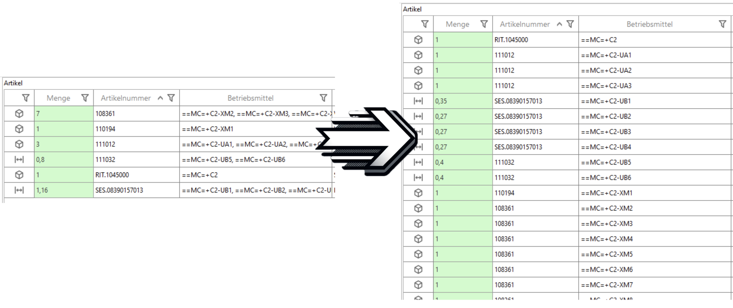 Betriebsmittel ( Kabel / Paket: Länge in Einheit des Projektes) wird zu Artikelreferenz ( Menge / Teilmenge in Einheit des Projektes)