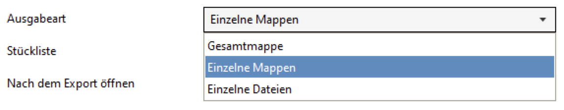 Einzelne Mappen: Es wird eine Datei erzeugt. Jede Stückliste wird in eine separate Arbeitsmappe generiert. Der Mappenname entspricht dem Stücklistennamen.