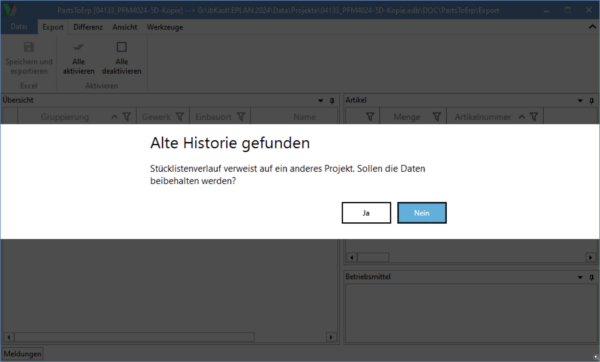 Wird ein ECAD-Projekt umbenannt oder kopiert, erfolgt nach der Änderung, nur beim ersten Start von PartsToErp eine Abfrage „Alte Historie gefunden“. Wird der Dialog mit Ja bestätigt werden die Projektreferenzen in den übernommenen Ständen korrigiert. Bei Nein werden alle alten Stände gelöscht.