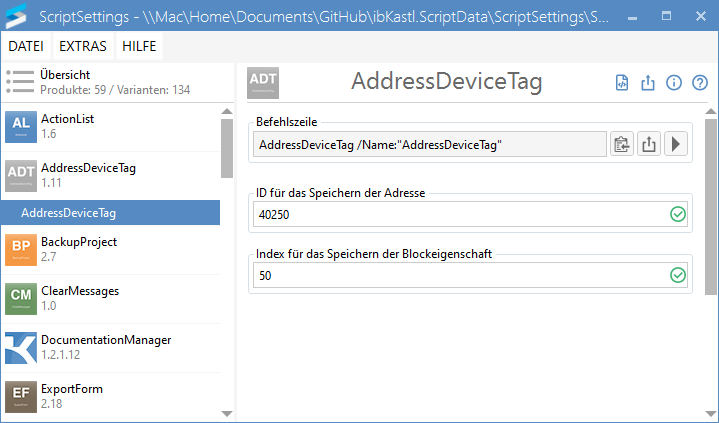Befehlszeile: Hier wird die Befehlszeile aus ScriptSettings eingefügt