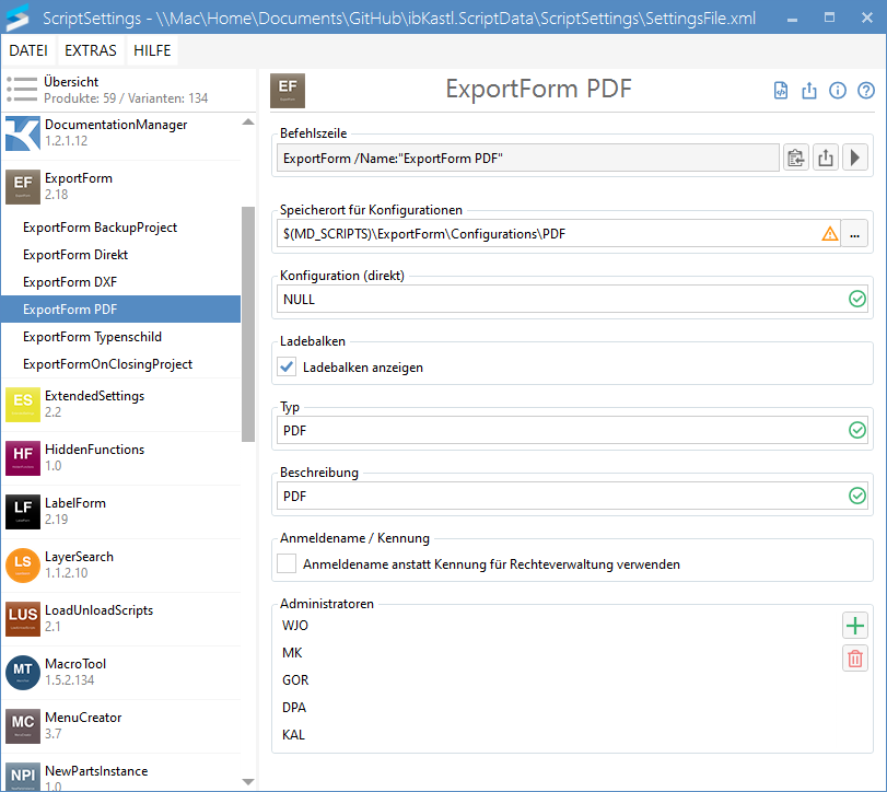 Um das Arbeiten mit ExportForm besser organisieren zu können, ist es wie in LabelForm möglich Admin-Rechte für bestimmte Personen zu vergeben. Diese haben dann die Rechte neue Konfigurationen und Beschriftungen zu erstellen. Alle anderen Anwender können Konfigurationen und PDF-, DXF- oder DWG-Dateien an- oder abwählen und den Export ausführen, jedoch keine Änderungen vornehmen.