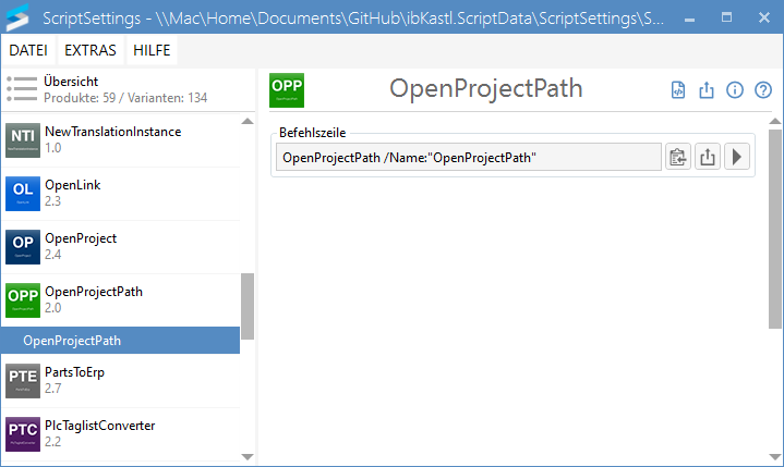 Die Befehlszeile kann kopiert werden und für den Aufruf zum Beispiel in eine Schaltfläche (Toolbar) eingefügt werden.