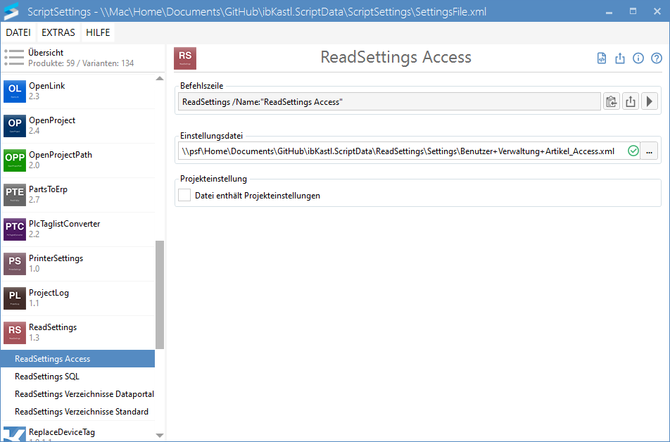 Mit ReadSettings ist es möglich, Firmen-, Stations-, Benutzer- und Projekteinstellungen automatisch in EPLAN zu laden. Ein praktischer Anwendungsfall, der oft zur Anwendung kommt, ist zum Beispiel das Umschalten verschiedener Artikeldatenbanken mittels Toolbar. So kann per Knopfdruck zwischen verschiedenen Datenbanken gewechselt werden.
