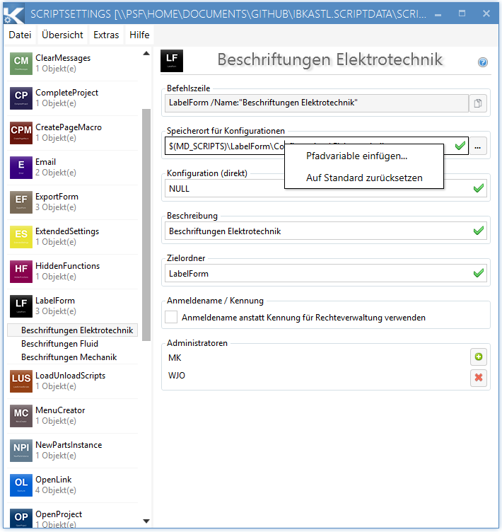 - Kontextmenü: Pfadvariable einfügen (nur bei Typ Pfad)