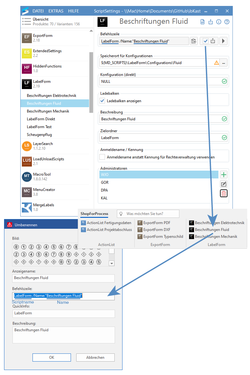 Aus dem Scriptnamen und dem frei wählbaren Namen wird die Befehlszeile erzeugt, die für den Aufruf über eine Toolbar oder MenuCreator verwendet wird. Die Toolbar kann automatisch aus ScriptSettings (gesamt oder einzeln) erzeugt werden.